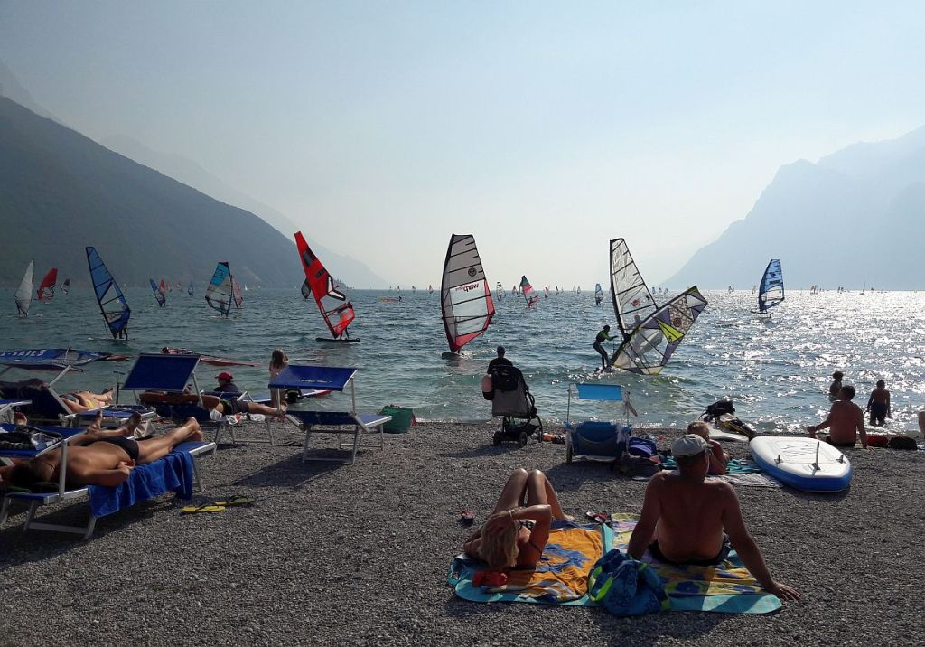 Am Gardasee machten wir einen Zwischenstopp, um uns wieder an die deutsche Sprache zu gewöhnen. Die Chance, hier einen Nachbarn zu treffen, ist jedenfalls deutlich größer als in Friedrichshafen an der Uferpromenade. Schwimmen ist allerdings nur in extra abgezäunten Minibereichen möglich, denn der See selbst ist von verschiedenen Wassersportlern belegt. Gerüchten zufolge ist neulich ein Eichhörnchen trockenen Fußes von Malcesine nach Limone quer über den See gewechselt, indem es von Brett zu Brett sprang.