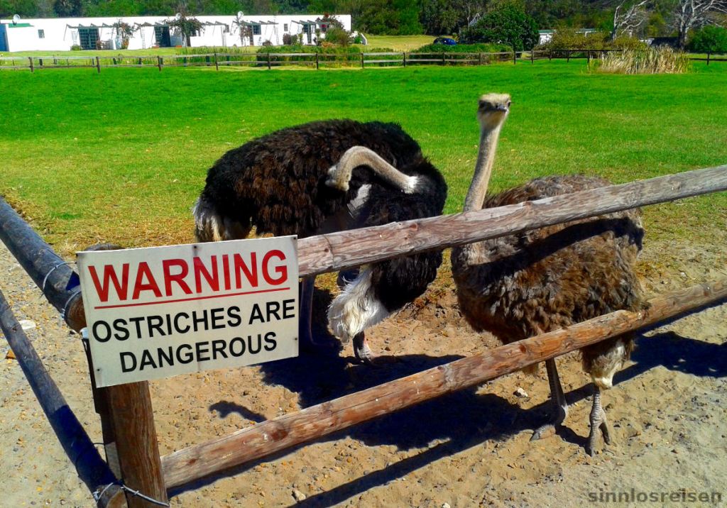 Unterwegs besuchten wir eine Straußenfarm. Wirklich gefährlich sind diese Riesenvögel nur, wenn man ihre Sprache nicht spricht.