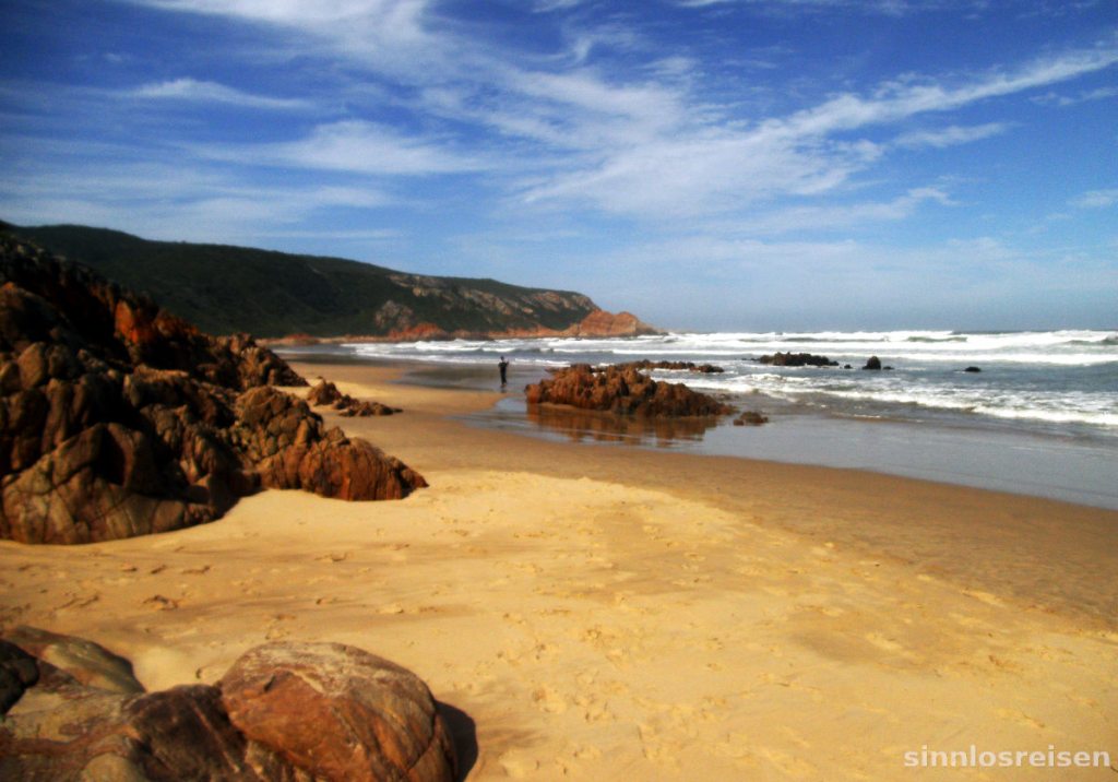 Ganz in der Nähe gibt es eine gut versteckte Abfahrt von der Hauptstraße, die über eine Schotterpiste bis zu einem Parkplatz führt. Dort beginnt der Abstieg über eine Treppe zum Noetzie Beach, einem der schönsten Strände hier in der Gegend. Die mühsame Anreise lohnt sich, denn hierher kommen nur wenige Touristen. Die meisten verirren sich in dem benachbarten Township und kommen nie wieder heraus.